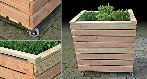 Das Grundmodul unseres Hochbeetes besteht aus einer speziellen Holzkiste mit einer stabilen Kunststoffwanne als Innenleben und einem Abdeckrahmen. Mit wenigen Handgriffen kann ein Rollen-Set montiert werden, wodurch das Kistenbeet mobil wird. Das Rollen-Set besteht aus 4 Rollen mit einem Durchmesser von ca. 50 mm, Verstärkungshölzern und Schrauben.